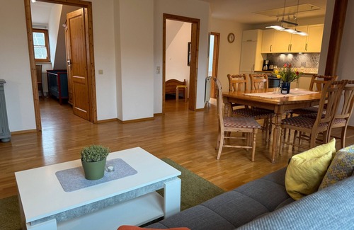 Our holiday apartment Jägerstube offers everything you need for a comfortable holiday. The 72 m² accommodation consists of a living room with two sofa beds, a kitchen, two bedrooms and a bathroom, and can accommodate up to 5 people. Amenities include Wi-Fi and a TV. A baby cot and a high chair are also available. In the garden area, you will find a table tennis table, a slide, a swing, a trampoline and other play equipment such as pedal cars. You may use the garden area. There is also a covered terrace at the entrance, which can be used together with the guests of the neighbouring apartment.