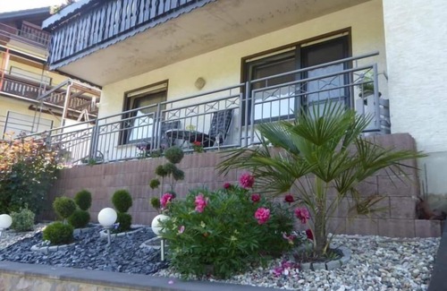 it is situated on a slope in the basement of our house with a separate entrance to the living area, allowing you to enjoy a beautiful view of the valley all the way to the rhine It was completely renovated and lovingly furnished in 2019.