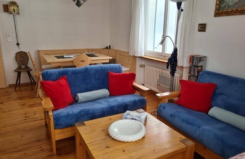 this 3-room apartment with 70 m2 is on the 1st floor, functional and rustic furnishings: living / dining room with dining area, two 2-seat sofas and tv and internet exit to the balcony, south facing position 1 room with 1 bed and 1 pull-out bed. 1 double room (box spring bed 180x200). Small kitchen (oven, dishwasher, capsule coffee machine (Matello), with exit to the small balcony. Bath / WC. Heating. Parquet floors. 2 small balconies. Terrace furniture. Very nice distant view of the mountains, the valley and the ski slope. Garage. The apartment are sunny all day. Suitable for families. A maximum of 1 pet / dog allowed. Cross-country slopes in front of the house. In winter free ski bus to the Furtschellasbahn and the village (stop approx.50m in front of the house). The Volg grocery store with meat counter and fresh bread can be reached in 5 minutes.