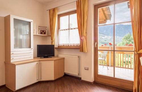 The cosy apartment "Tischlerhof - Typ B mit Terrasse" is located near Dorf Tirol (Tirolo) near Meran (Merano) in South Tyrol and offers space for 4 persons. The modern and charming apartment has a large living/dining area and a well-equipped kitchen with dishwasher. Furthermore, there are 1 bedroom and 1 bathroom available. Wi-Fi, satellite and cable TV are also part of the apartment's equipment. Outside there is a very nice south-facing terrace where you can enjoy the panorama and the magnificent view of the beautiful South Tyrolean landscape. The Tischlerhof is situated on a natural hill, in the middle of an untouched forest, where you can have a barbecue, read a book or if you feel the need to be alone. The nearest restaurants are 1 minute by car (approx. 1 km) away in Kuens (Caines) and approx. 4 minutes by car (approx. 2 km) away in Dorf Tirol (Tirolo). Supermarkets and cafés are also located in Dorf Tirol (Tirolo). The spa town of Meran (Merano) with its world-famous thermal baths, the beautiful old town and the enchanting Christmas market is only about 2 km away. The area is also very popular with hikers thanks to its numerous hiking trails, orchards and vineyards. The Tischlerhof is an ideal starting point to discover the hiking paradise of Hochmuth (Meraner Höhenweg) and Hirzer. In winter the nearby skiing areas such as Merano 2000 (about 6 km away) can be easily reached. The capital of South Tyrol, Bozen (Bolzano), can be reached by car in about 35 minutes (about 36 km).