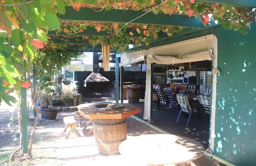the rear patio has all the facilities and more for the gourmet chef (bbq, gas pizza oven, commercial oven, stove top, large fridge freezer, 6x4 coolroom available for hire at $20 per night, large table which seats 16 people, open fire at one end and a "hot box" heater at the other end. 20 litre hot water urn for that coffee or cup of tea, blinds which help to control the elements,. there is also an evaporative air conditioner at the southern end of the back patio for those hot summer days.