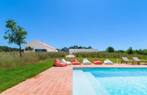 The holiday home Casa Do Regadio - Casa Principal with step-free access is located in Zambujeira do Mar and is the ideal accommodation for a relaxing getaway. The 350 m² property consists of a living room, a kitchen, 4 bedrooms and 4 bathrooms as well as an additional toilet and can therefore accommodate 12 people. Additional amenities include Wi-Fi with a dedicated workspace for home office, a smart TV with streaming services, a washing machine, a dryer, beach/pool towels as well as children's books and toys. 2 baby cots and a high chair are also available. This accommodation does not offer: air conditioning. Welcome to our vacation rental with an enticing private outdoor space. Take a refreshing dip in the pool, bask in the lush garden, unwind on the open terrace, find shade on the covered terrace, savor grilled delights on the barbecue, and rinse off in the outdoor shower.