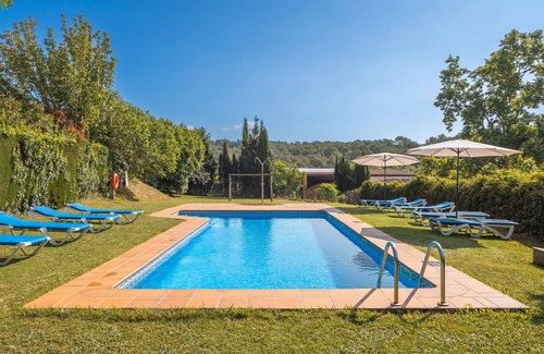 The holiday home Can Mas in Fontcoberta is the ideal accommodation for a relaxing holiday with a mountain view. The 550 m² property consists of a living room, a well-equipped kitchen, 6 bedrooms and 6 bathrooms and can therefore accommodate 15 people. Additional amenities include high-speed Wi-Fi (suitable for video calls), a TV, air conditioning, a fan, a washing machine as well as beach/pool towels. Furthermore, a table tennis table and a pool table are available on the property. A baby cot is also available. This property features a private outdoor area with a fenced pool, garden, covered terrace, balcony, barbecue, playground, and outdoor shower.