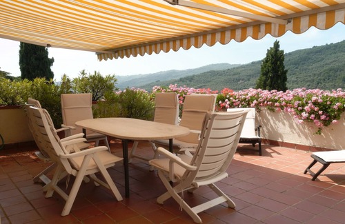 description of the object: the old stone farmhouse on a hillside terrace with a wonderful panoramic view 5 room apartment which extends over 3 levels, 2 bathrooms z. T. in natural stone. Living room connected by an arch to the fitted kitchen. Large living room furnished with high quality furniture, 3 bedrooms, one of them with its own shower room. Floor heating in all rooms, 2 fireplaces, large roof terrace with electric awning. On the hillside terrace below the pool 7.5x2.5 m, paved garden with oranges, limes, cypresses and cedars. Access up to 45m to the house possible.