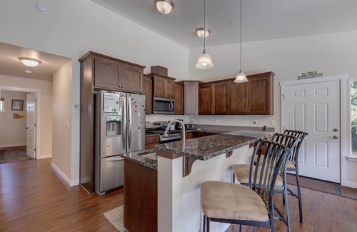**inside, comfort meets elegance:** step through the main entrance to find a well-appointed entryway with ample storage, leading into a spacious, open-plan living area The heart of the cabin is its living, dining, and kitchen area, featuring a cozy wood-burning stove (firewood provided), ductless heat and air conditioning for year-round comfort, and a flat-screen monitor for entertainment. The dining area comfortably seats six, perfect for family meals, while the kitchen boasts marble countertops, an island workstation and breakfast bar, all-new Whirlpool stainless steel appliances, setting the stage for your culinary adventures.