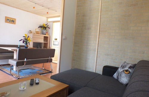 the living room is equipped with a comfortable sofa that can be pulled out into a comfortable double bed in no time There is also a coffee table and a flat screen TV and invites you to relax and linger.