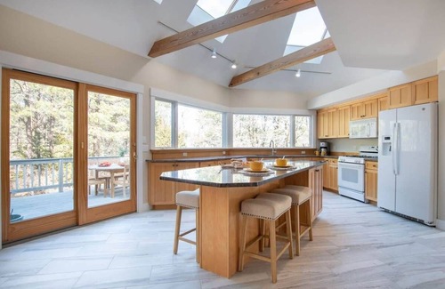 with nearly 5,000 square feet of space to relax and enjoy, this home is a wonderful gem hidden away in wellfleet Stepping into the home, your jaw will drop when you see the towering ceilings over the kitchen. The space is flooded with natural light from patio doors, wall to wall windows, and skylights in the vaulted ceiling above, shining light past the exposed wood beams onto both the first and second floor.