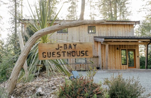This beautiful Tofino vacation rental home features 3 spacious bedrooms all with ensuite bathrooms. After a day on the beach, unwind in the private hot tub. This luxury retreat will be your home away from home for your vacation holiday to Tofino. J-Bay Guesthouse is located on the Jensen's Bay waterfront with Forest and peek-a-boo water views on a tidal inlet bay. mountain and sunset view from out on the detached deck accessed by a boardwalk