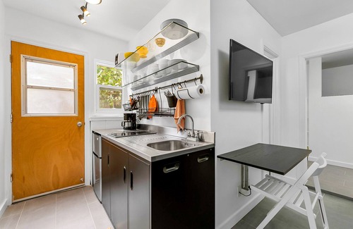 when it comes to sleeping arrangements, each bedroom has something unique to offer Downstairs, the first bedroom doubles as an office with a workstation - complete with high-speed internet. On the second floor, the guest bedroom adds a touch of sophistication with a four-poster bed, and the primary suite wows with a large jetted tub with impeccable garden views. This home also boasts a studio with a separate entry for added privacy. This studio is perfect for people looking for a private space away from others (even for a bit)! This space boasts an inviting living area with a sofa bed, a TV, a working space with a desk, and a well-appointed kitchenette with a mini-fridge, two-burner stovetop, coffee maker, and utensils.