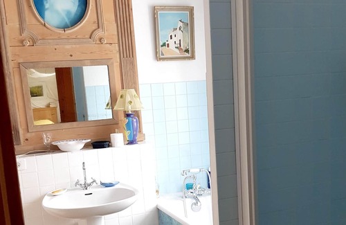 the villa has 5 comfortable bedrooms, 1 including a double bed, 1 including a bunk bed, 1 including a double bed and a private bathroom with a bath tub and toilet, 1 including a double bed and a sofa bed and a private bathroom with a shower and toilet and 1 including a double bed and a sofa bed and a private bathroom with a bath tub, a shower and toilet The bathroom is fitted with a shower and a toilet.