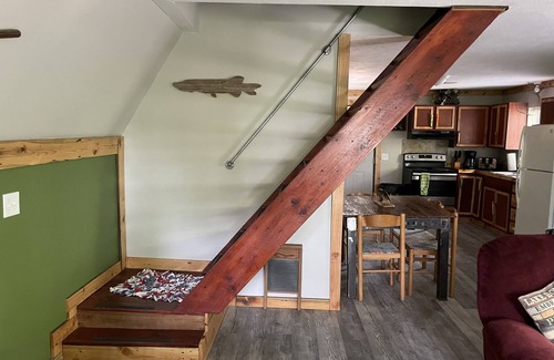 Musky Hideaway Cabin is a spacious 2-bedroom A-Frame sitting on a hill with trees on multiple sides of the property. It has recently been remodeled with unique fishing decor. There are two balconies - 1 is private from a bedroom and one is off the main room and attached to the porch leading to main grass area. Additionally, off the back of the cabin is a covered deck/patio with a private area for hot tub use and a fire ring area on gravel with wood log seating area. Check-in time is 5pm is and Checkout time is 12pm (noon). Unfortunately, the parking area can NOT accommodate a boat and trailer at this time..