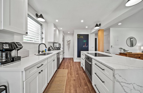 this thoughtfully designed home features approximately 1,840 square feet of living space with modern amenities and island-inspired décor Each bedroom offers a plush King bed, air conditioning, and a private TV, ensuring comfort and entertainment for every guest. The primary bedroom boasts ocean views and a TV that elegantly drops down from the ceiling.