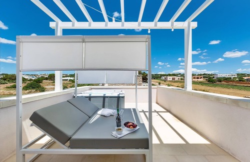 Recently-built one-bedroom luxury suit in exclusive panoramic penthouse, with terrace and Jacuzzi, on the first floor of Perla Saracena Luxury Suites, the most exclusive property for holidays in Salento. A true excellence.