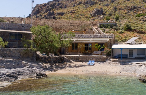 this is a recently renovated house just by the sea, which has been a fisherman's shelter in the pastThat fisherman was my grandfather, and he would surely had been glad if he could enjoy the present luxury of the place. A small rocky beach is right in front of the house.There is a spacious open plan kitchen with dining area with stunning sea views and the master bedroom with private bathroom next to it. There are 2 more bedrooms in the house and one more bathroom in the back. Of course, the best part, is the outside of he house, where you can rest on the beach or enjoy your lunch listening to the waves. Even when it is windy, something quite usual in the area, the place is picturesqe.....