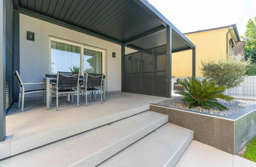 Costa Emilia Romagna House in a villa 50 meters from the sea in a newly built semi-detached house. Garden with automatic gate, internal parking space. Entrance patio equipped with table and chairs where the sun sets. Inside there is a dining area, a living room with satellite LCD TV, and a kitchenette equipped with a dishwasher, microwave, fridge with freezer. Additional room with single sofa bed and wardrobe. The sleeping area has a double bedroom with private bathroom and small private garden and a further single bedroom with two beds and bathroom with shower. Covered patio livable externally. washing machine, electric pergola air conditioner are just some of the small details that make your stay unforgettable
