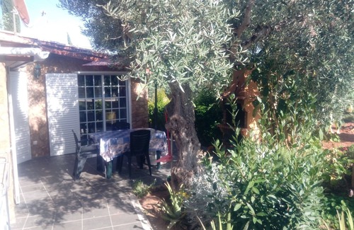 welcoming house, entrance, bathroom with spacious shower, kitchen overlooking barbecue, 2 bedrooms with a double bed, living room with sofa, terrace of 30m2, garden furniture, park parking, and private pool of 7m50 x 4m50 fenced for child safety