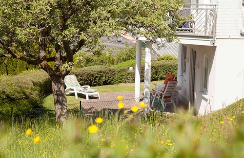 a spacious living and dining area with sofa bed and a very good kitchen equipment with dishwasher (toaster, blender, egg cooker, coffee maker, etc) make sure that you feel comfortable. The apartment has a separate entrance, a storage room for bicycles, daylight bathroom with shower and toilet, bedroom with spring mattress and adjustable slatted frame (180 cm x 200 cm), LED satellite TV and radio. Outside you will find a beautiful sun terrace and a large lawn..