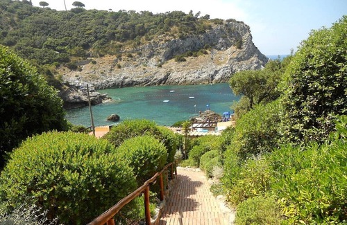 We rent a holiday home in a marvelous place by the sea with a panoramic swimming pool and exclusive equipped beach resort all included in the price (also bar and restaurant on the beach - restaurant also open in the evening) facing a wonderful sea view. It overlooks the blue sea and offers a breathtaking sea view from its terrace. Elisetta's house is suitable for a family with 2 or 3 children. The large terrace is equipped with table and chairs for outdoor dining and chairs and sun loungers if you like to enjoy the sun and the sea. There is also a practical outdoor barbecue. You can enjoy your breakfast on the terrace and dinner in the evening under a starry sky that is reflected on the sparkling sea. Not only exclusive equipped beach (umbrella, two beach beds and two beds and internet service on the beach) but also a fantastic panoramic swimming pool and equipped solarium near the house. Also a practical shuttle service to the beach every 15 minutes. Everything is included in the price. On the beach - exclusive beach resort - with restaurant and bar open from the end of May to the end of September. At home you have your private parking in front of the house. In Cala Piccola you can find an ideal place for your complete relaxation with lots of privacy and breathtaking views of the sparkling blue of the Mediterranean.