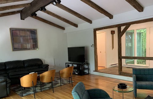 This secluded, air-conditioned, well-appointed property is 90 miles from New York City, and five minutes from the Hudson River. This home and surrounding property is also available for weddings, events and location filming. The very large living room with beamed vaulted ceiling has a stone fireplace for cozy days and nights. Move outside to the spacious decks to enjoy our Hudson Valley skies and beautiful private wooded surroundings. There is a fire pit outside to enjoy the beautiful evenings. The eat-in kitchen and dining room with deck and gas grill make entertaining fun. The arbor covered front deck has wheel chair access to the double front doors. Your master suite has a king-sized bed, walk-in closet, and a large bathroom with shower stall. Two more bedrooms are on the main floor, one queen size and another with two twin sized beds. There is a spacious hall bathroom with double sinks and privacy for the toilet and tub/shower area. The downstairs fireplace is surrounded by a large, entertainment area, a bedroom with two twin beds, and a full size bathroom with tub and shower. The home is equipped with High speed Wi-fi, internet, telephone within the US and 65" Smart HDTV. Large windows in all rooms give the feeling of being in the middle of the trees. Beautiful grounds and views..