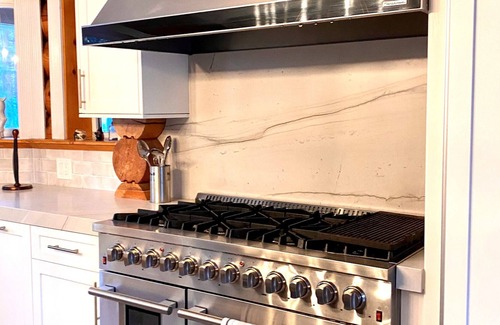 back inside, a newly remodeled gourmet kitchen, with beautiful natural brasilian quartzite stone countertops, new appliances and new woodplank flooring provides all the essentials and more for cooking up a feast for a crowd There's a professional-grade gas range, a built in refrigerator, built in "drawer" style microwave, dishwasher, and plenty of counter space for prepping. Serve up snacks or casual meals at the kitchen counter with bar stool seating, or drinks at the wet bar next to the kitchen.