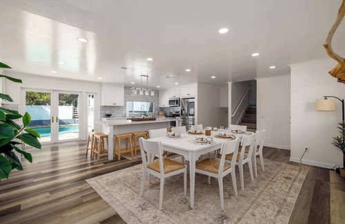 enjoy a bright, open-concept kitchen and dining area with plenty of natural light and direct access to the pool through sliding glass doors The dining table seats 8, with additional bar seating at the island — perfect for family meals or entertaining. The kitchen is freshly updated and fully equipped with premium appliances, including a dishwasher, coffee maker, and all the essentials you need for cooking and dining with ease. Whether you're staying in for a home-cooked dinner or grabbing coffee before the beach, this kitchen is designed to feel like home.