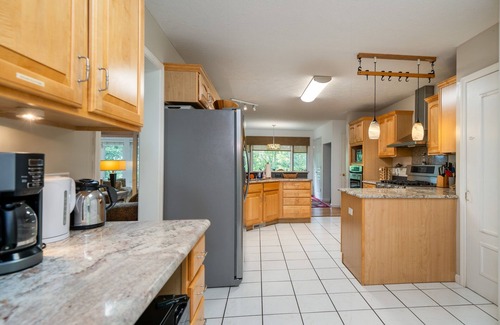 the house is situated on a steep hill, surrounded by 35 acres of forest, out of sight from neighbors. The road to the house and the driveway are NOT steep. But with the hillside falling off quickly below the house, so there is not a lot of yard. The huge deck seems to float among the tree tops, offering shade when you want it, but magical views of far-off mountains. It will be easy to forget that you are less than a mile from Starbucks, fine dining, groceries, breweries and other conveniences.