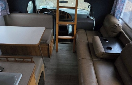 master br is private and has a queen bed The Dining room table and couch converts/pulls out to accommodate 4 more guests. There's also room for two more in the front, overhead area.