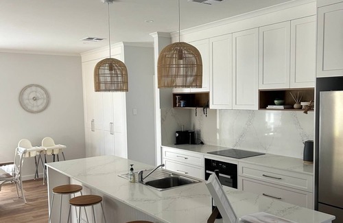 you will enjoy the spacious open plan living area The kitchen has delightful stone bench tops, with ample cooking appliances and space required for your stay (kettle, pod coffee machine, toaster, George Foreman grill, slow cooker). The kitchen overlooks the 85” TV and lounge area, with 12-seater (2.7m long) dining table adjacent the lounge area.