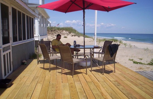 Three bedrooms, 1 bath traditional cottage on bluff overlooking the Atlantic Ocean on the South Shore. Full screened front porch with private beach access. Well equipped kitchen with dishwasher, washing machine (no dryer - clothesline out back), two refrigerators, gas stove, microwave, coffee pot, toaster oven, blender. TV with cable and internet access, large table on front porch and another table with umbrella out front on wooden deck. Gas grill.