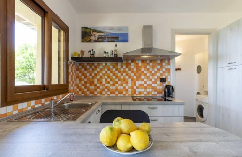 "il mandarino", 2-room house 50 m2, on the ground floor Bright, tasteful and cosy furnishings: living/dining room. Exit to the terrace. 1 double bedroom with 1 bed (140 cm, length 200 cm). Exit to the garden. Kitchenette (oven, 4 induction hot plates, toaster, kettle). Exit to the garden, to the terrace. Shower/bidet/WC. Heating available only from 15.10. to 15.04. Terrace 20 m2, large terrace 60 m2. Panoramic view of the sea and the countryside. Facilities: washing machine, hair dryer. Internet (WiFi, free). 1 pet/ dog allowed.