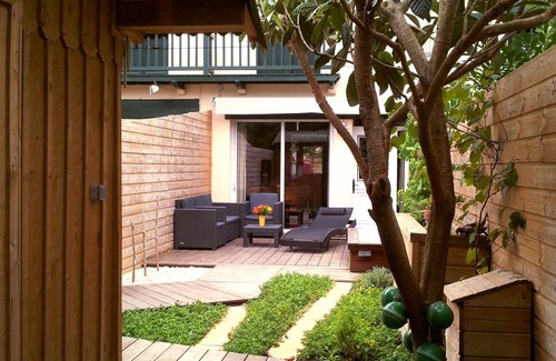 the living room separated from the kitchen by 1 convivial bar gives directly on 1 picture window with a beautiful perspective on the deep wooden terrace and the raised garden with its small fisherman's hut The garden furniture with its deckchair, its sofa, its two armchairs and its outdoor bathtub (hot water) under a beautiful vine, no vis-à-vis thanks to the large all-weather awning. All in 1 cozy garden, all 15m deep. Movable electric barbecue.