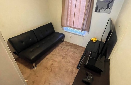 a massive couch that can fit the whole family, 3 bedrooms (1 currently is for storage only), 2 bathrooms and includes a washer / dryer