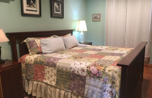 The apartment is over a garage, accessed by three decks, behind the house where I live with my dog, Winnie and my indoor cats-Mack, Jack & GC. I have an outdoor kitty, Clara, who walked out when I brought home foster kittens and refuses all attempts to bring her back inside.