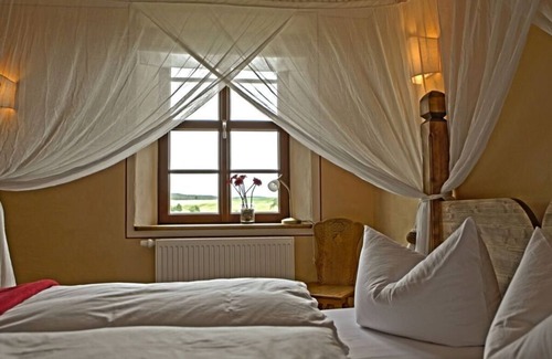 it is one of these places that you rarely find today! remote, surrounded by green, you live in harmony with nature - just ideal for a relaxed time, apart from everyday stress You can expect a harmonious mix of stylish antiques and modern comfort. The kitchen is equipped with stove plates, toaster, coffee machine, kettle and all cooking utensils and dishes. In addition to 2 bedrooms, 2 more people can sleep on a sofa bed in the living room. In our historic tavern with an open fireplace, you can try regional delicacies and medieval recipes.