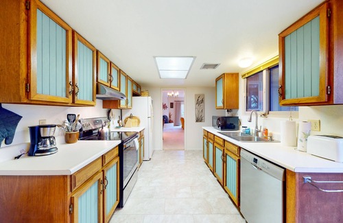 upon entry, you'll be met with a bright interior and a cozy, carefree atmosphere throughout the well-appointed living space Relax and make yourself at home by resting on the plush furniture, indulging in a movie marathon on the large TV, or serving brunch on the outdoor patio, showcasing the spectacular hill and valley view. Hobby chefs will love creating culinary charms in the sophisticated kitchen, equipped with ample cupboard room and a quaint dining table. Comfortable beds in spacious bedrooms ensure that everyone will receive a wonderful night's sleep from the day's adventures. The main bedroom boasts a private entry to the patio, perfect for stargazing or waking up to a peaceful morning with your cup of coffee. A separate office provides space to read or check your email. Enjoy the abundant nature around the property, from the views of the mountain range and the frequent hummingbirds around the patio to the occasional gila woodpeckers and quails and rabbit sightings.