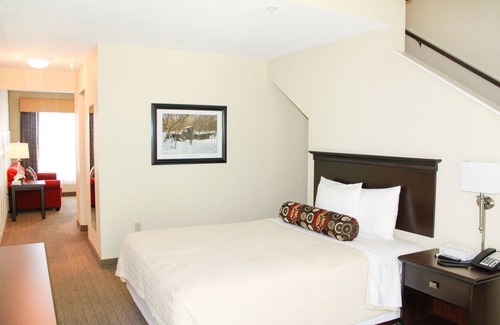 the iroquois suite is situated on the second floor of the hotel and has two levels The first floor contains living and sleeping areas separated by the bathroom. The second or loft level has a spacious bedroom with two queen size beds and a cozy sitting area by the dormer window that overlooks the lake. Each of these units also has access to a common balcony. This unit can sleep up to six adults. The first floor has one queen bed, and the second floor has two queen sized beds side-by-side.