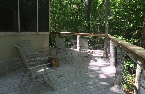 the large deck looks into the canopy and down to the dock It is perfect for grilling and enjoying an outdoor meal, bird watching, and having a firefly counting contest. There is also an outdoor fire pit, complete with plenty of free firewood to enjoy a fire while enjoying an evening breeze.