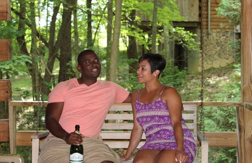 the cabin living room area features a wood-burning stone fireplace with wood, tv with the basic dish network package, dvd, and a spacious covered front porch with swing and rockers The private hot tub and gas grill are located on a back covered deck. Cabin also has a dishwasher and Washer/Dryer.