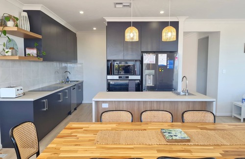 property details: 4 bedrooms - super king [upstairs]; queen; queen; 2 king singles & single mattress [downstairs] Sleeps 9 (maximum 6 adults); Quilts, blankets and pillows provided – BYO sheets, pillowcases, towels, bathmats & tea-towels OR optional linen hire $170 available through Country Getaways office; optional linen service fee $80 for beds to be made. Upstairs ensuite bathroom adjoining master bedroom with walk-in shower, vanity and toilet; Main bathroom downstairs with bath, walk-in shower, and vanity; Separate toilet; Hairdryer. Ducted air-conditioning throughout for year-round comfort. Spacious upstairs living area comprising large lounge room, kitchen and dining space with access to balcony; Lounge room has sofa seating, with large smart television (with USB and HDMI ports); Board games; Books. Fully equipped kitchen with electric stovetop and oven, microwave, dishwasher, Nespresso coffee machine (guests can bring compatible pods or purchase locally), and large French-door fridge with freezer on the bottom; Large range of kitchen appliances including sandwich press, kettle, toaster, slow cooker, stickmixer and blender. High chair; Stairgate. Spacious downstairs games room with seating and pool table, and access to rear yard. Top load washing machine; Clothes dryer; Iron; Ironing board; Pull-up clothesline. Large entertaining area on balcony with sea views of Port Hughes jetty and towards Moonta Bay; Ceiling fans; Outdoor dining and seating on balcony; Family Weber Q gas barbecue. Undercover area at rear overlooking lawned yard; Deck chair seating; Outdoor shower with hot and cold water; Fenced rear yard; Outdoor games including cricket; Crab nets. Off-street garage parking for 1 medium-sized car; Driveway parking for 2 cars; Parking at rear on gravel for a boat; Additional street parking at front of house. 3-minute walk to beach. Sorry, pets not permitted..