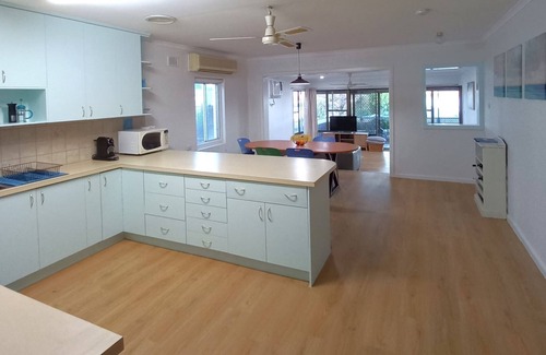 property details: 3 bedrooms - queen, queen, queen and trio bunk (double on the bottom, single on the top) Sleeps 9 (maximum 6 adults, top bunks only suitable for children); Quilts and pillows provided – BYO sheets, pillowcases, towels, bathmats & tea-towels OR optional linen hire $30 per person available through Country Getaways office. Bathroom with bath, walk-in shower, vanity & toilet. Reverse cycle air-conditioning in lounge room; Dining area has reverse cycle split-system air-conditioning; Ceiling fans in all bedrooms; Living area has ceiling fan. Large television (with USB port) in lounge room; Foxtel. Well equipped kitchen with electric stovetop & oven, microwave, and large fridge with freezer on top; Nespresso coffee machine (guest will need to bring compatible pods or can purchase locally). Sunroom has sofa seating & bean bags; Wall-mounted television; Board games. Front load washing machine; Pull-up clothesline in rear yard. Undercover entertaining area; Outdoor seating & dining; Weber Q hooded gas barbecue; Spit roaster (guests need to bring coals to use); Herb garden. Fire pit (guests need to bring their own wood & observe fire regulations). Fenced yard with 4-foot fence. Off-street parking for up to 3 cars, with room for a boat; No guest access to garage. 5 minutes’ walk to beach. Sorry, pets not permitted..
