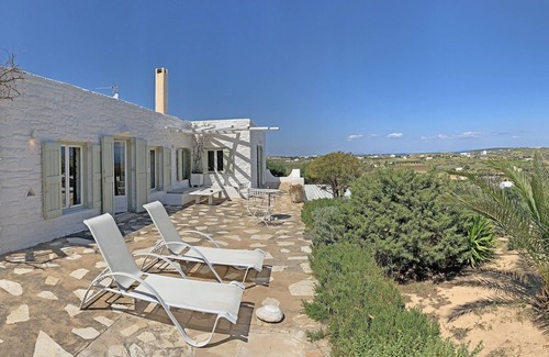Quiet and charming house surrounded by a Cycladic natural environment. The house is located 7 minutes by vehicle from Naoussa and 700 metres from the beach of Ampelas, easily accessible on foot. the surface of the house is 160 m2 with sea view terraces and verandas all around, as well as huge garden