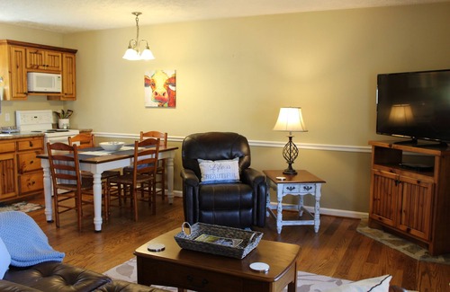 King bed (brand new top of the line Sealy), fully equiped and stocked kitchen including icemaker and dishwasher, in unit washer/dryer, all linens and towels included, central air/heat, 55" Smart TV, Direct TV, wifi and DVD in living room and Smart TV, Direct TV in bedroom. Close to the Blue Ridge Parkway, wineries, breweries, restaurants, hiking, mountain biking, kayaking and canoeing. Fiddlers Convention, Blue Ridge Music Center and famous Rex Theatre. If you need us to shop for you, or stock something special, we'd be happy to..