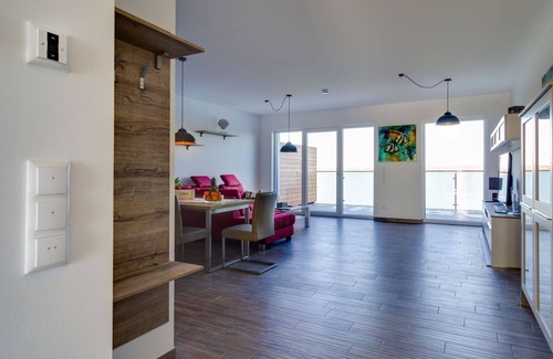 "kapitänskajüte", 2-room apartment 55 m2 Bright, cosy furnishings: living/sleeping room with panoramic window with 1 sofabed and satellite TV (flat screen), radio. Exit to the balcony. 1 double bedroom. Open kitchen (oven, dishwasher, 4 ceramic glass hob hotplates, electric coffee machine). Shower/WC. Heating. Balcony. Balcony furniture. View of the port. Facilities: safe, children's high chair, baby cot (extra), hair dryer. Internet (WiFi, free). Parking at the house. Please note: non-smokers only. Smoke alarm. Wohnung im Erdgeschoss oder im Obergeschoss.