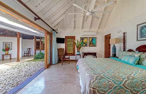 karma bay’s six bedrooms are all air-conditioned with individual media systems and private en suite bathrooms featuring waterfall showers and two of the en suites boast extended al fresco shower areas Four of the bedrooms have king-sized beds, while two have twins which may be configured as kings. The waterfront-facing bedrooms all open out onto a private terrace area. Four of the bedrooms are joined to the main house by elegant covered pavilions that offer views of the lawns and the ocean. All bedrooms have cell phones for ease of calling the butler.