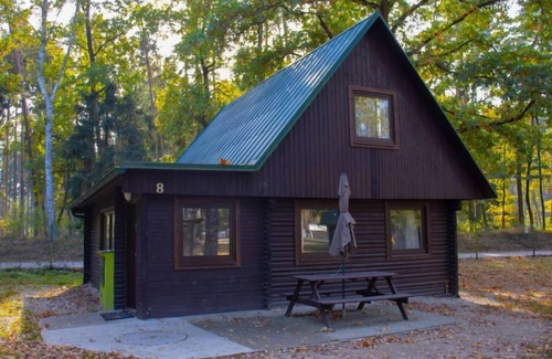 Child friendly holiday village "Kemp Stříbrný rybník". 25 houses in the resort. In the district of Malšova Lhota, 5 km from the centre of Hradec Králové, along the wooded area, on the lake. For shared use: property. Table tennis, boccia (extra), beach volleyball, arbour, barbecue, fireplace, children's playground, bathing jetty. In the complex: reception, restaurant, bar, bistro, playroom, washing machine (for shared use, extra), bicycle rental. Parking (extra) on the premises. Bus stop "Stříbrný rybník" 700 m, railway station "Blešno" 5 km, sandy beach, bathing lake 50 m. Sports harbour, minigolf, sports centre, walking paths from the house, cycle lane, fishing possibilities 50 m. Nearby attractions: Adventure park Firmsport, letní kino, tutistický vláček do lesa, Stezka siluet, Rytířské hradiště 3 km, Park Na Větvi 3 km, Obory se zvěří 4.2 km, Obří akvárium, Botanická zahrada 4.7 km. Hiking paths: Pohádková, Vodnická stezka 6 km, Planetárium, planetární stezka 8.4 km, Zoopark Stěžery, Rozhledna Milíř 15 km. Please note: entertainment in the season. Suitable for families. Fishing [permit required]. The photograph shows a typical example.