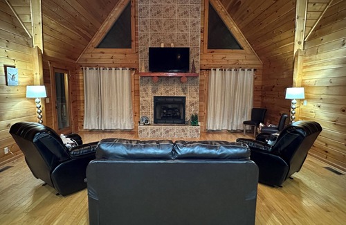 Forget your worries in this spacious and serene space...the cabin is a quiet and beautiful space to rest and relax with your family. Enjoy the indoor fireplace, outdoor fire pit, wrap- around porch, large yard, upstairs loft with games and window seat for reading a great book, full kitchen and laundry room, pond for fishing (with prior approval), WI-FI and Smart TVs.Please note: The property is on a dirt road.