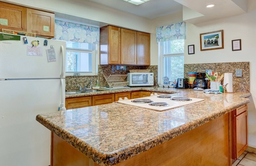 inside, the thoughtfully designed layout provides ample space for families or couples, with two spacious bedrooms (each with their own private balcony), two updated modern bathrooms, and a sleeper sofa in the living area The fully stocked open-concept kitchen with bar seating flows seamlessly into the dining and living areas, making it easy to cook, gather, and unwind.