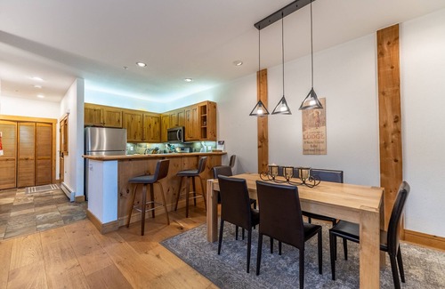 This 2-bedroom, 2.5-bathroom townhouse sleeps 7 with a king bed, a twin-over-queen bunk bed, and a sleeper sofa. It features a private one car garage equipped with a EV charger and private laundry. The deck offers beautiful treed views with mountains in the distance. With the resort shuttle picking up nearby you’re just minutes from the gondola, shopping, restaurants and festivities. Ski Tip offers shared amenities including an oversized, centrally located hot tub. Guests of Ski Tip also have access to the Dakota Lodge pool and hot tub.