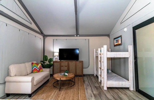 the kilimanjaro nestled among the center of the resort with a view of the lake, offers a peaceful stay for four The luxury canvas cabin includes one queen-sized bed, two twin-sized bunk beds, a sitting area, a spacious bathroom, 55” Smart TV with wifi, kitchen table, private covered deck, private wood-burning hot tub, four burner propane griddle, and a fully equipped kitchenette, complete with a mini refrigerator, microwave, coffee maker, air fryer, and essential cookware. The luxury canvas cabins are fully equipped with all modern essentials such as heating and cooling as well as hot running water. The perfect combination of exploring nature's finest beauty with a modern, elegant twist. Enjoy the scenery on the spacious covered deck with comfortable outdoor furniture. Want a relaxing dip in warm water? Enjoy your own private wood-burning hot tub just a few feet from your private deck. Feeling friendly? Enjoy the communal wood-burning fire pits or hammocks throughout the grounds of the resort.