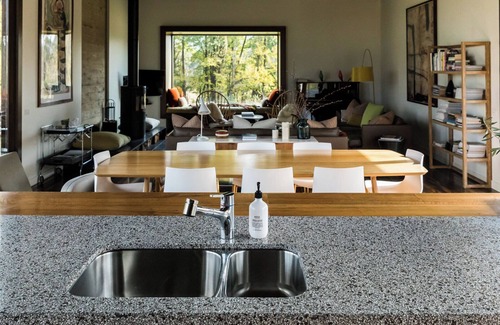 adjoining the living space is a modern, luxuriously equipped kitchen with ilve appliances Perfect for cooking with local produce while keeping an eye on the spectacular scenery and bulls in the paddock below.